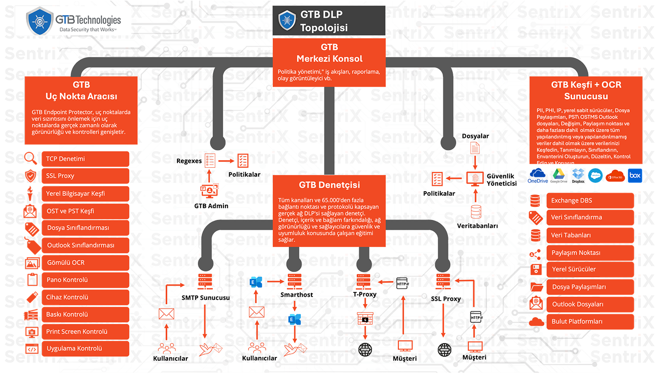 Patentli ve patent bekleyen tescilli teknolojiye dayanan; GTB'nin "İçerik Duyarlı Ters Güvenlik Duvarı" TM Ajanı, ağınızdan TÜM giden ve/gelen veri iletimlerini gerçek zamanlı olarak inceler, sınıflandırır ve analiz eder.